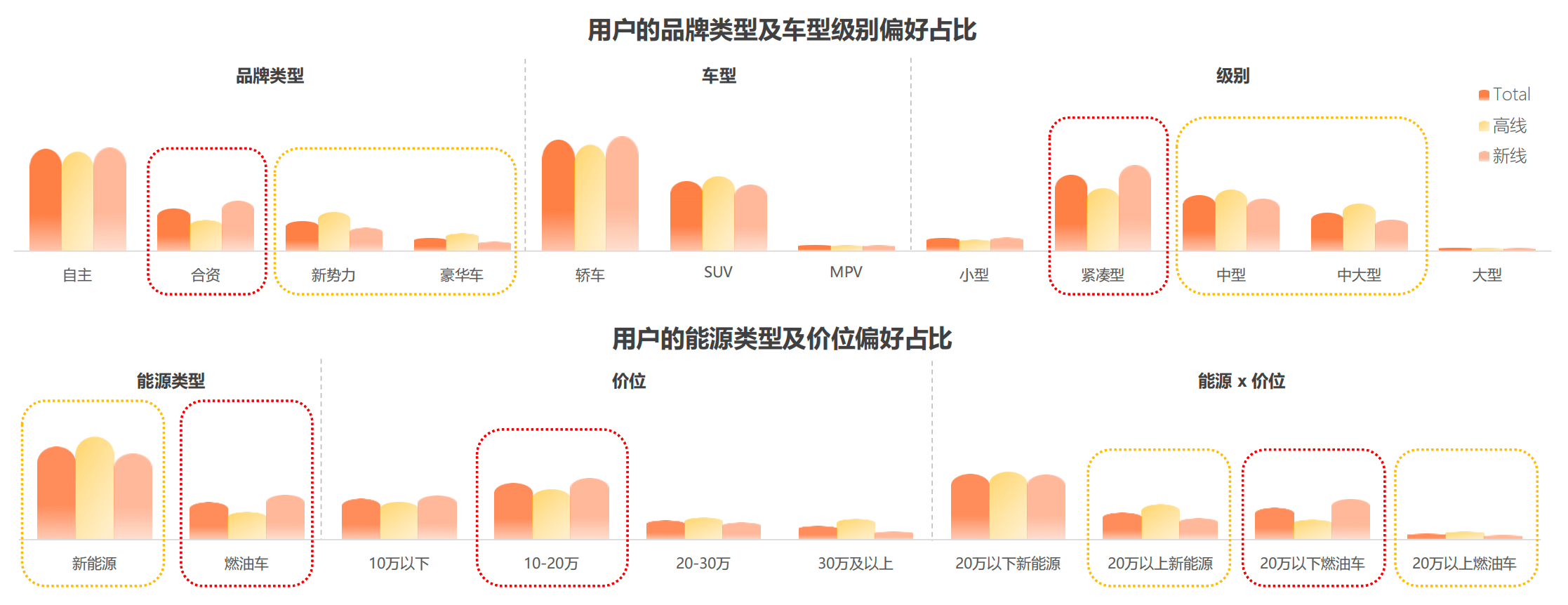 快手则主要聚焦增量市场。以新线市场的男性、30-49 岁中青年为主,蓝领(货车司机、网约车司机等)占比较高。这类用户注重情绪价值与性价比,偏好“接地气”内容。快手的增量价值在于,快手高线索量的车型多为自主品牌、20万以下的燃油车。传统爆款燃油车及新能源小型车是快手平台上的标杆车型,10-20万元的各类车型都有较高发展潜力。此外,快手拥有2.3亿非重合用户、近 6800 万非重合汽车强兴趣用户,新能源车主占比47%。新能源车预购比例更是高达65%。