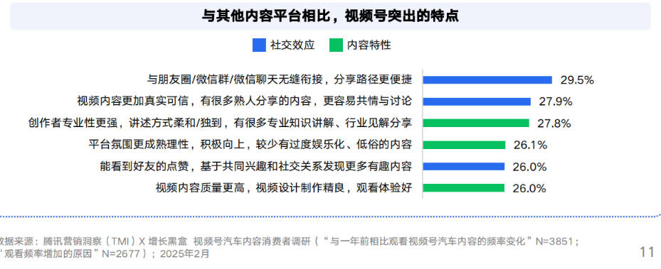 且和抖音“24小时流量峰值后快速衰减”不同,视频号的一次初始互动能带来5个新增有效观看,且内容发布30天后仍能获得稳定流量,长尾价值非常突出,成为品牌传递品质感的重要渠道。而在用户眼中,与微信社交的无缝衔接、基于熟人关系链的内容传播、专业高质量的内容与成熟积极的氛围,是视频号最突出的特点。