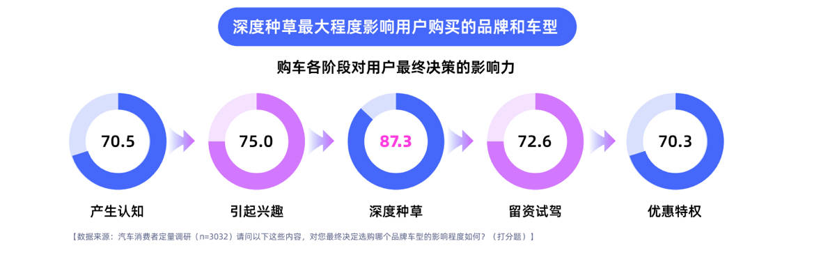 然而现实中,多数品牌的内容投放与用户需求之间仍存在明显错位。CTR(央视市场研究)调研数据显示:在用户的购车决策链路中,“深度种草”的影响力高达87.3分,远超其他环节,堪称决策链上的“致胜一击”。但主机厂却把超过四成的预算砸在了线索采买上,且未来还将进一步加码。