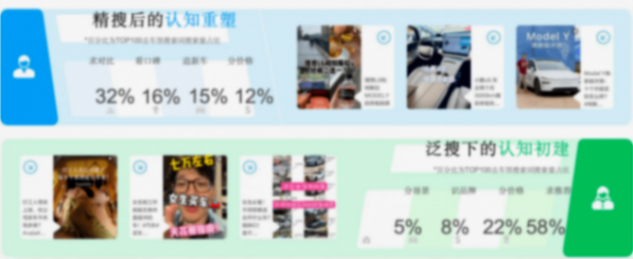 此外,小红书在一定程度上还占据了百度的生态位,定位“搜索引擎”。汽车内容上,用户的搜索行为也清晰地分为“泛搜”和“精搜”——