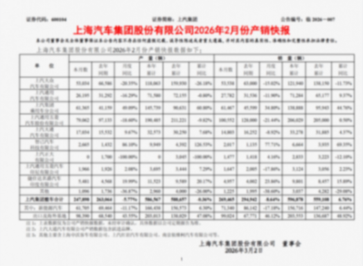 3月1日,上汽集团发布2026年2月及1-2月累计销量数据。数据显示,该集团2月份实现整车销售26.9万辆,结合1月份销量,1-2月累计销售59.7万辆,同比增长6.8%,在1月取得开门红后,继续保持行业领跑态势。