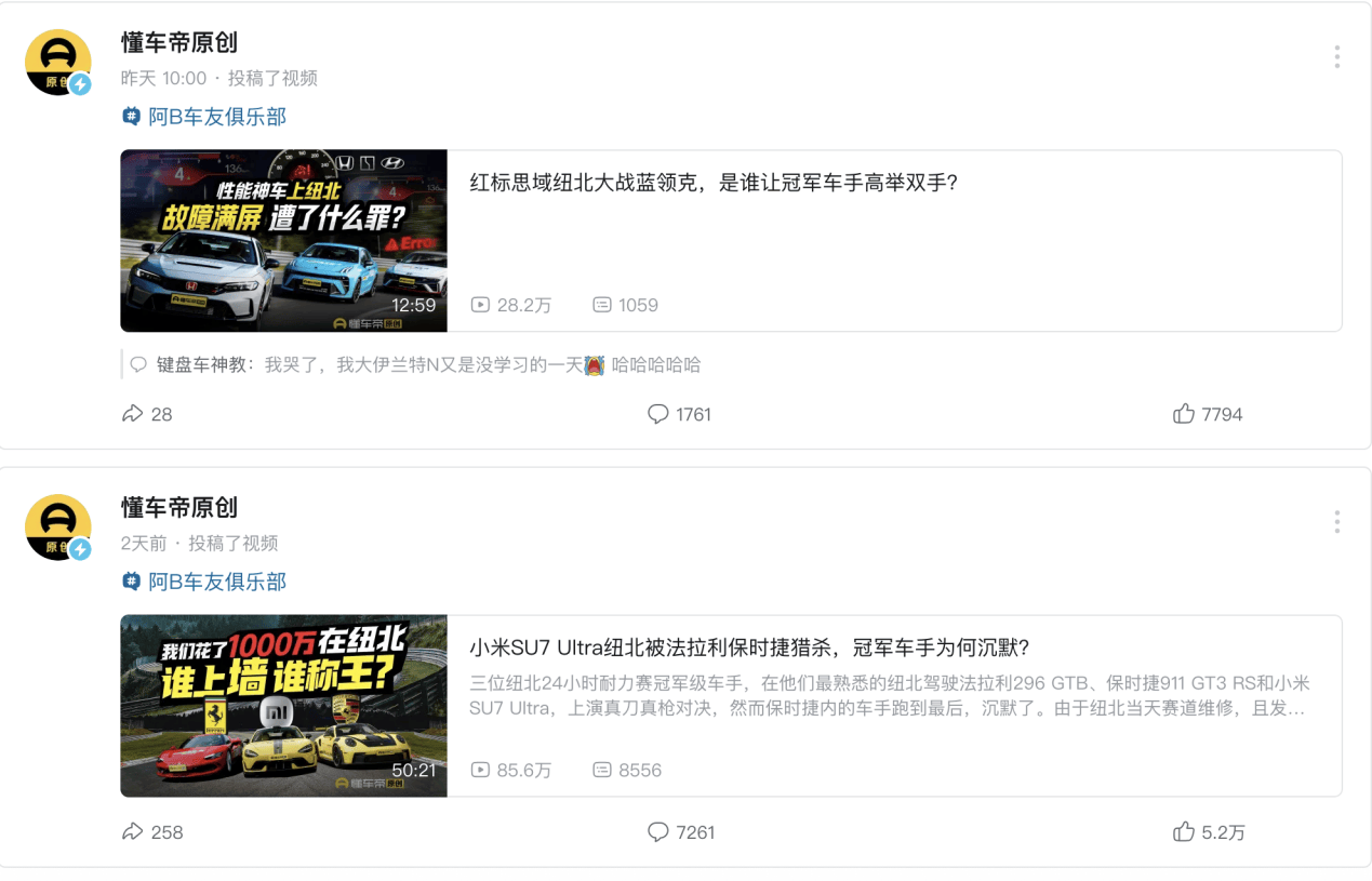 很显然,懂车帝如此大的投入,又有国内头部媒体达人也无法企及的资源整合能力,再加上强大的人手布局和现场执行能力,不会只拍资深车迷才喜欢的深度内容——整个纽北系列视频,都会考虑到路人和新入坑准车迷的观感,视频剪辑节奏偏长,也是生怕观众理解不到“为什么快?”“快在哪儿?”