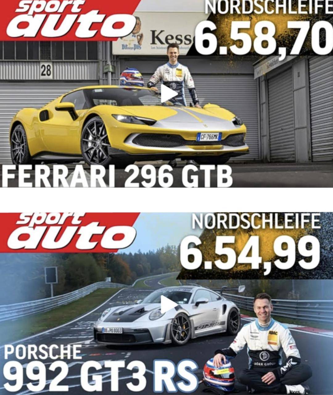 法拉利官方没有刷圈的传统,目前296 GTB只有德国老牌汽车杂志SportAuto请专业车手包场20.6km跑出来的成绩6:58.70(带AssettoFiorano套件),是目前杂志测试过最快的法拉利;992代GT3 RS保时捷官方测试20.8km是成绩是6:49.32,SportAuto跑出来20.6km是6:54.99;小米SU7 Ultra官方圈速20.8km成绩是7:04.957。